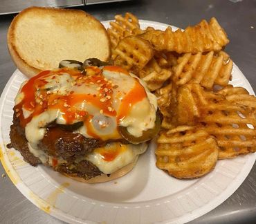 All burgers are seasoned and marinated 1/2 lb patties. All burgers served with Chips. Substitute French Fries, Waffle Fries, Sweet Potato Fries, Potato Rounds, Onion Petals, or Coleslaw for $2.